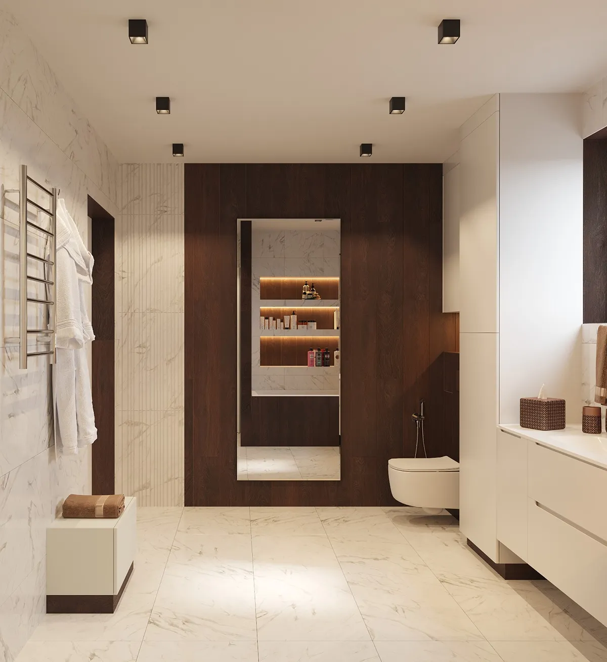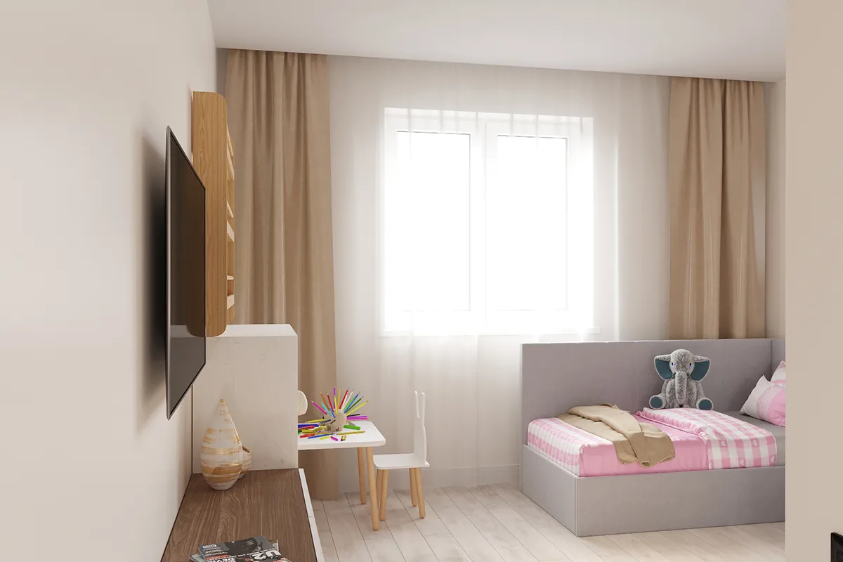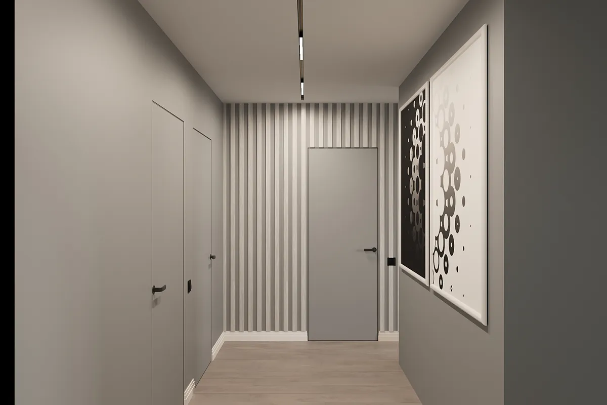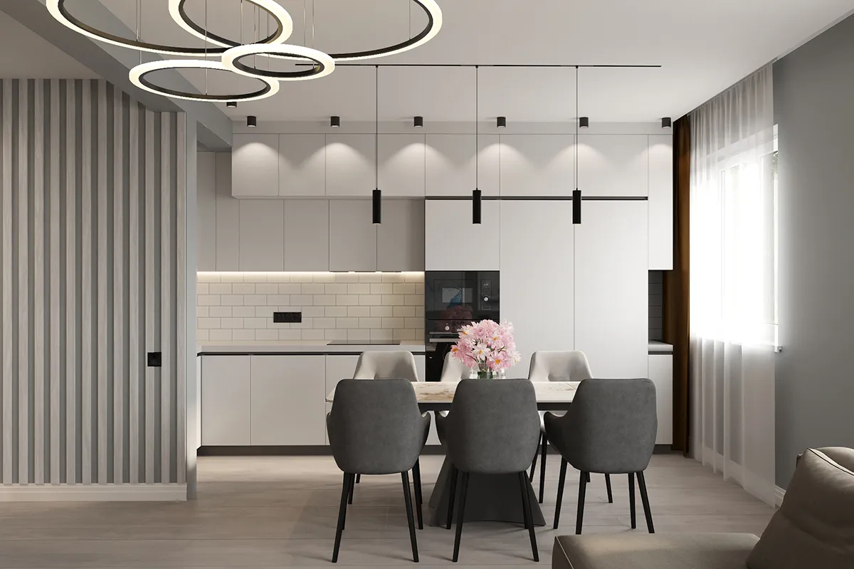 Интерьер отличается минимализмом, чистыми линиями и использованием нейтральных оттенков, что придает пространству элегантность и функциональность. В оформлении активно использованы современные материалы и многофункциональная мебель, создающие атмосферу уюта и комфорта.